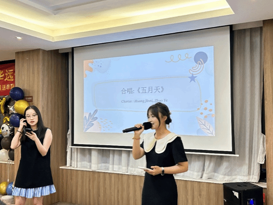 As the atmosphere became livelier, Teacher Yu Zhige took the stage impromptu recitation of the poem "Facing the Sea, with Spring Blossoms", offering poetic wishes to the students. He was followed by teacher Jin Yige, who performed a cheerful folk song, "Lift Your Veil". His performance prompted continuous applause and cheers from the teachers and students in the audience.