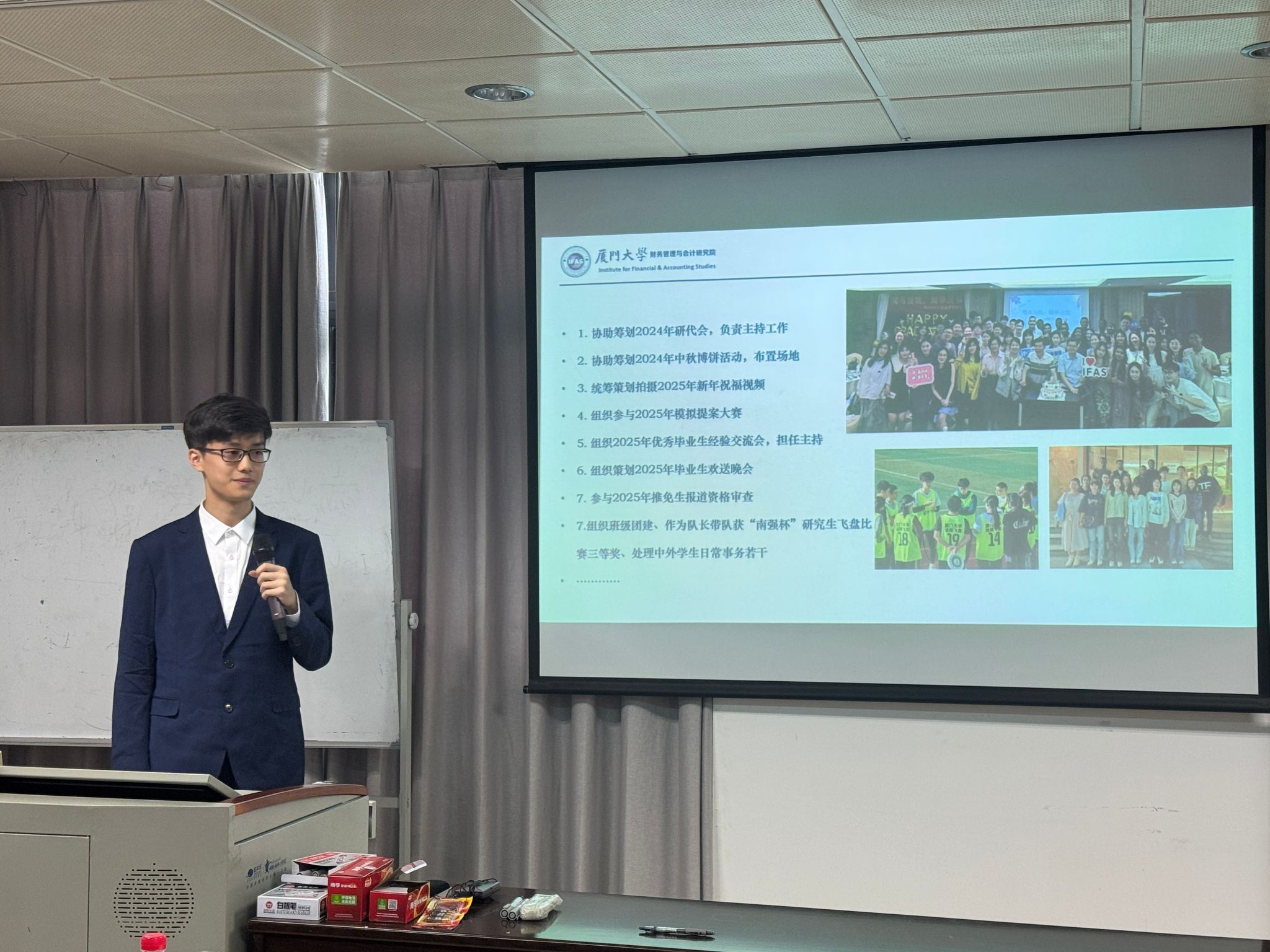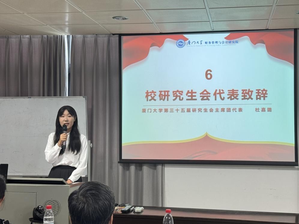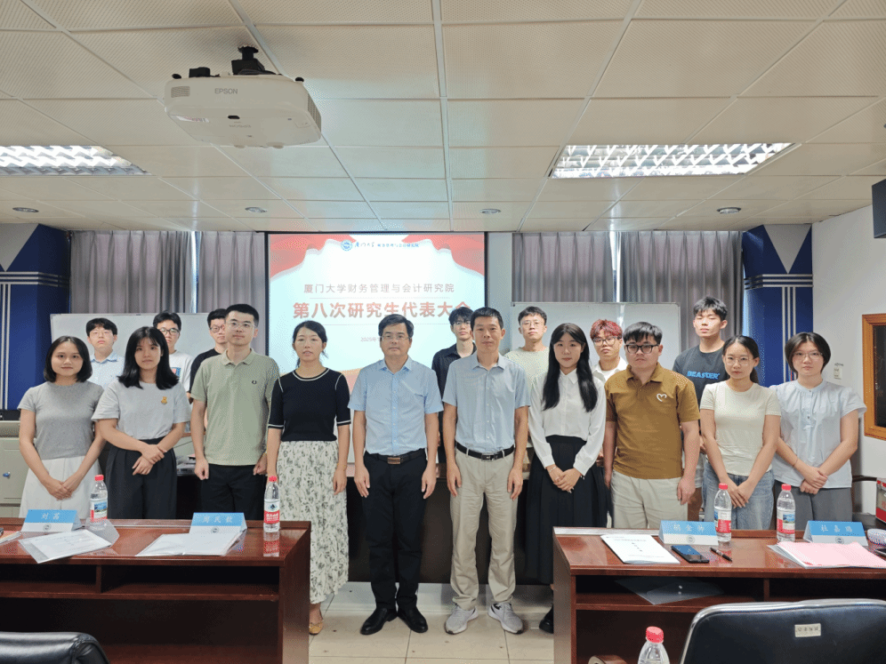 On October 17, 2025, the 8th Graduate Student Congress of the Institute of Financial Management and Accounting (hereinafter referred to as "the Institute") at Xiamen University was successfully held in Room 501, Jiageng Building No. 2. Distinguished guests attending the congress included Zhou Minqin, Deputy Secretary of the Party Committee of the School of Management; Hu Jinshuai, Vice Dean of the Institute of Financial Management and Accounting; Liu Qian, Secretary of the Youth League Committee of the School of Management; Huang Jinfu, Deputy Secretary of the Youth League Committee of the School of Management; Liu Qun, Deputy Secretary of the Youth League Committee of the School of Management; Chen Yimei, Counselor of the School of Management; as well as representatives from the Xiamen University Graduate Student Unions ,and the elected student representatives from our Institute.