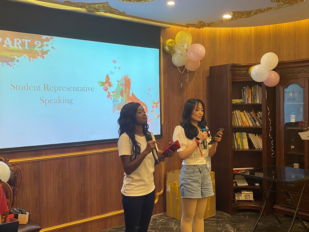 Next, on behalf of the graduates, Suyi Liu came to the stage to speak. She expressed her sincere gratitude and blessings to our alma mater. As she said, we will never forget that the phoenix flower blossoms in two seasons, one season to welcome the new year and one season to bid farewell. Outside the long pavilion and beside the old road, we will bid farewell to the graduates and wish each other a better and brighter tomorrow.