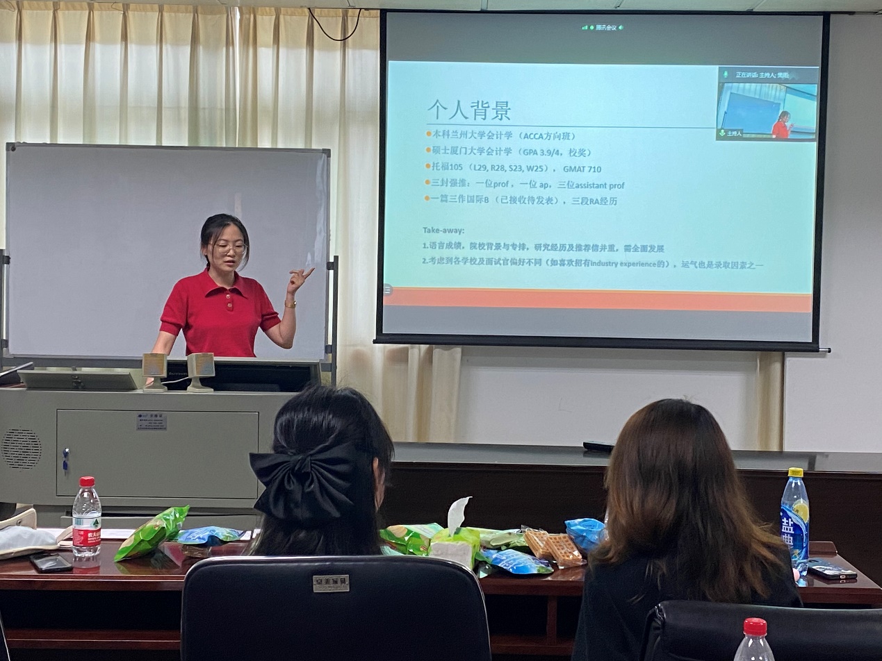 The exchange meeting was hosted by Anqi Chen. The meeting was divided into three parts: guest introduction, free questioning and group photo session. The first part is the sharing of Suyi Liu. As a student representative for pursing Ph.D. study, Suyi Liu explained the application deadlines and application points of different schools, introduced the key points of different schools when applying, and emphasized the need to clarify goals as soon as possible, so as to do a good job of subtraction in life; She also pointed out the need to do plan B to add weight to life. In the free questioning session, Suyi Liu answered the question of how to read papers efficiently, and pointed out that it is necessary to determine the topic in advance and select articles from top journals. While reading classical literature, we should also dabble in the latest studies. In specific reading, you can first judge whether the article meets the needs by reading the abstract, and then continue to read the empirical models and other parts of the paper.