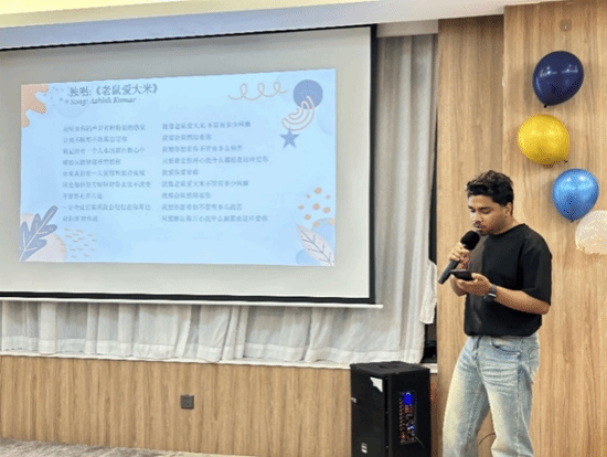 After the dinner, the gala officially entered the performance segment. The first performance was by Ashish Kumar, an international student from India, performed the song "Mouse Loves the Rice". As the familiar melody rang out, the atmosphere grew lively and cheerful.Many students in the audience began humming along,while the glowing stivks waved to the rhythm, blending with Ashish Kumar’s wonderful singing into a sea of joy. Next, Peter Kekeli, an international student from Ghana, sang "Goodness". His soulful voice touched everyone in the hall, and the performance ended with thunderous applause.Ashish Kumar then made a surprise return to the stage,presenting a vibrant dance medley. Whith each change of rhythm, his dance steps shifted style, giving the audience a vivid taste of exotic charm.