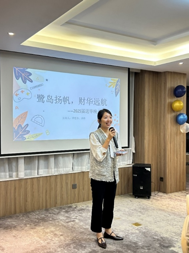 First, Deputy Party Secretary of the School of Management Zhou Minqin delivered a speech. Secretary Zhou expressed his heartfelt congratulations to the graduates and offered them several pieces of advice: Firstly, students should maintain their insight on their future paths, understand the underlying logic of development, and adhere to their original aspirations without being swayed by personal gain. Secondly, they should cultivate a resilient personality, believing that perseverance will lead to victory. Additionally, Secretary Zhou emphasized the importance of ideals and ambitions and encouraged students to dare to pursue their careers. Finally, Secretary Zhou stated that graduates should keep the school motto "Pursue Excellence, Strive for Perfection" in mind, always remember the warmth of IFAS and that the alma mater will always be a safe haven for everyone.