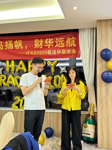 After the performance segment, Zhou Minqin, Deputy Party Secretary of the of the School of Management, and Hu Jinshuai, Deputy Dean of IFAS, together cut the graduation cake. Finally, all the teachers and students gathered for a group photo, preserving the memory of this unforgettable evening.