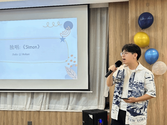 Afterward, first-year graduate students Huang Jinni and Zhuo Ye performed a song  "Mayday", echoing the spirit of  this extraordinary May. Its light, breezy melody conjured the sense of late spring giving way to early summer—the cicadas not yet heard, the wheat just awakening.. Next came a solo by first-year graduate student Wang Yilian who sang "Pearls and Jade". Her moving voice portrayed both the brilliance and fragility of emotions over time, with the hope that friendships as precious as pearls would continue to shine warmly even after being polished by the long river of years. Then, second-year graduate student Li Bohan performed a solo of "Simon". His bright,powerful voice combined with emotional devotion, ending with enthusiastic applause and cheers from the audience.