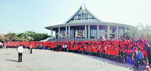 他们还穿着橘色衣服,在厦大科艺楼前照了张全家福,足足排了45米长,才把所有的人都装下。