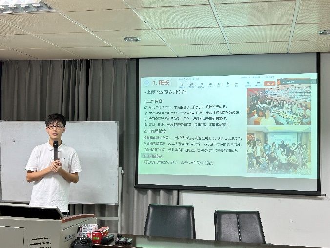班长吴东鸿分享了过去一年的工作内容、工作繁忙度和工作感受,他形容班长为与同学交流沟通、拉近师生距离的贴心伙伴;团支部书记吴铭洁向同学们展示了其所担任职务的工作内容,并表示团支部书记这一职位虽然工作较为繁忙但能够获得很大的成长和进步。