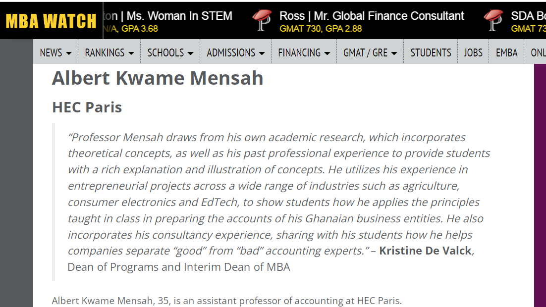 Albert Kwame Mensah 2013至2015年间在厦门大学财务管理与会计研究院(IFAS)攻读会计学硕士学位。2019年,在取得香港城市大学博士学位后,因优异表现先后收到多个国际知名大学的工作邀请。他最终接受并受聘于法国巴黎高等商学院(HEC Paris),任职助理教授。近日,Albert入选2023年Poets & Quants “全球前40位40岁以下商学院教授”名录。