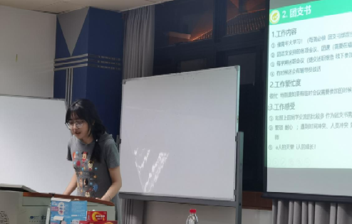 随后,学习委员张语涵同学介绍了学习委员的相关职务,鼓励想要尝试的同学积极报名;文体委员佀海月盈同学强调在学习的同时也要劳逸结合,生活中不仅有诗和远方,同样需要一个文体委员带你迈开腿感受现实的美好;最后是身为党支部委员的陈晓颖同学向同学们展示了身为一名党支部委员需要承担的责任,其表明担任党支部委员并非易事,但自己从这个职位中获益良多,希望有兴趣的同学积极报名。