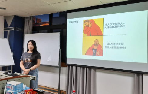 司徒海莹同学首先对各位新生的到来表示热烈的欢迎,随后开始了交流会的第一个环节——自我介绍,自我介绍环节采用指定接力式的方式,每个同学在自我介绍完毕后指定下一位觉得印象深刻的同学进行自我介绍,在座的无论是22级还是23级的同学均需要参与。指定接力的自我介绍方式将在场的每位同学都联系了起来,有同是舍友的同学,来自相同地方或者相同学校的学姐学弟学妹,大家在自我介绍中畅所欲言,增进了彼此之间的了解。