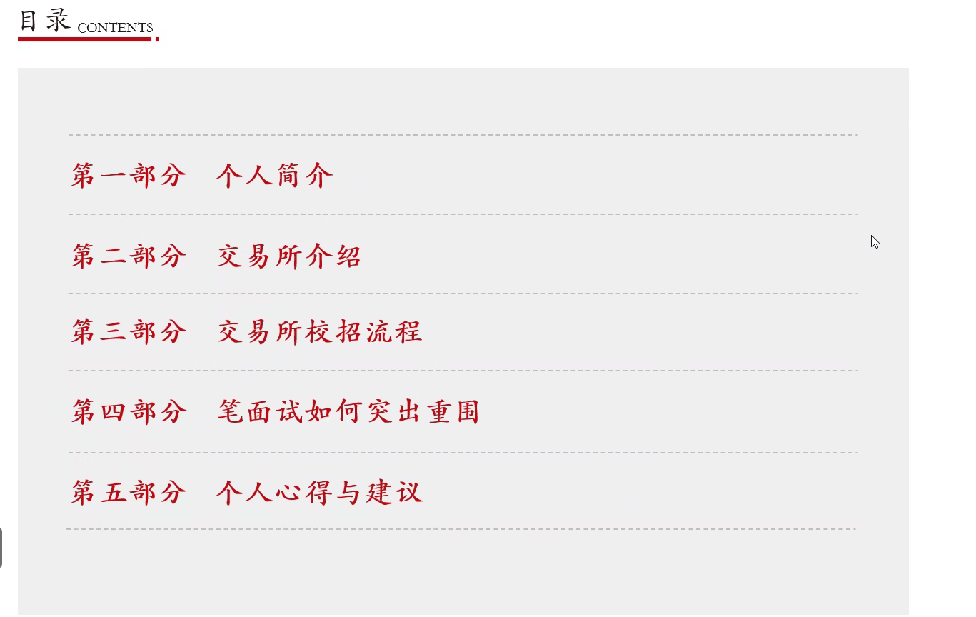 接下来是入职交易所的尹梓伊同学进行分享。尹梓伊同学首先介绍了交易所的职能和部门构成,随后讲解了各交易所的校招流程、在各考核阶段的关注重点以及笔试面试如何突出重围,强调要注重专业知识,关注时事热点。最后,尹同学建议同学们在秋招过程中不必内耗,要积极行动,注意及时止损,状态不好时积极采取措施改变状态。
