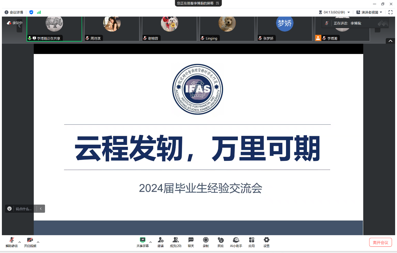 时光荏苒,岁月如梭,转眼间又一届IFAS学子即将告别厦园,愿他们展翅高飞,前程似锦。2024年5月27日下午,财务管理与会计研究院学生联合会举办了线上2024届毕业生经验交流会。会上,毕业生代表受邀分享宝贵经验,为学弟学妹们指点迷津。