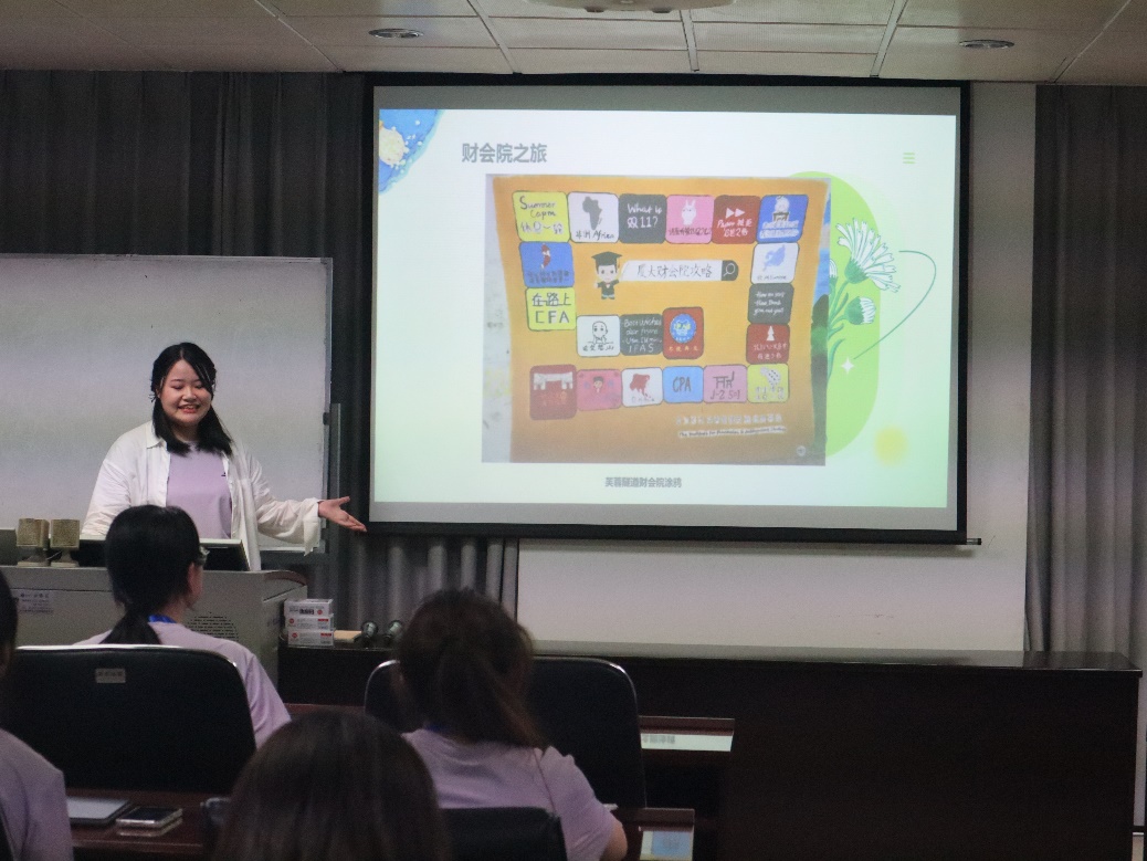 接下来,财会院2023级会计学硕士研究生周昕语给营员们带来学习方面的经验分享。周昕语同学首先介绍了我院所归属的财务管理、会计学两个专业的学科实力,两个在全国均名列前茅;紧接着,周昕语同学介绍了学校的数据库资源、财会院的课程具体安排以及学院毕业生就业去向等,向营员展示了IFASer学习的方方面面。
