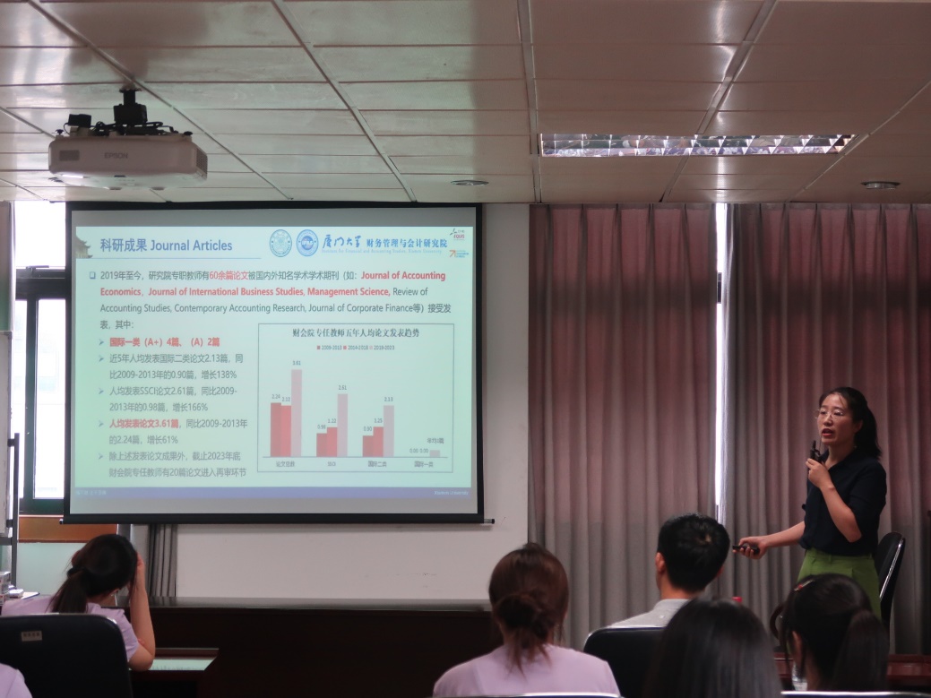随后,财会院教师代表侯芳芳从学院的目标与定位、学院发展大事记、领导团队、师资力量、科研成果、生源情况、毕业生就业去向等多个方面对学院展开了介绍,展现了我院国际化的办学特色、群英荟萃的平台优势、独树一帜的创新风采,充分地体现了我院作为国家“985工程”全国唯一的财务与会计创新基地的特点。