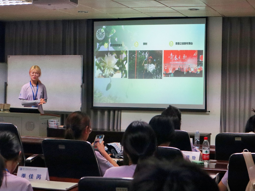 学习分享之后,财会院2023级会计学硕士研究生冀宇涵为营员们带来生活方面的分享。冀宇涵同学的分享分为衣、食、住、行四个方面,不仅展示了厦大食堂令人垂涎欲滴的美食、白城沙滩治愈心灵的日落与海浪,也分享了赛龙舟、攀树等丰富多彩的社团活动,不禁使在场的营员畅想未来在厦园的美好生活。