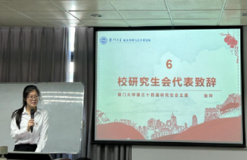 会议第三项,由厦门大学第三十四届研究生会主席金玲同学致辞。金玲同学代表校研会对财会院过去一年的工作给予了高度肯定,希望财会院接下来一年的工作能够与贯彻落实党的二十大精神和学习贯彻学校第十二次党代会精神紧密结合,关注同学诉求,反馈同学利益,并与校研会紧密联系。