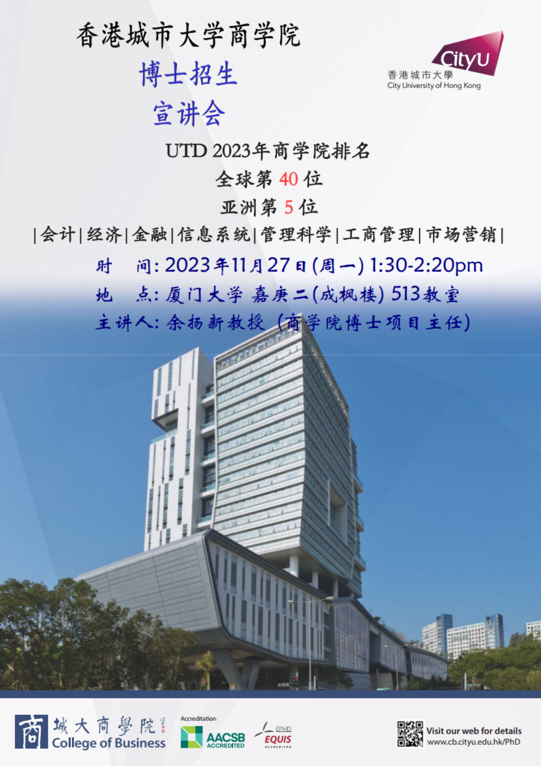 香港城市大学商学院博士项目主任余扬新教授将于11.27(下周一)中午1:30在嘉二513教室进行招生宣讲和咨询。城大商学院的博士项目包括会计、经济、金融、信息系统、管理科学、工商管理、市场营销等,欢迎届时到场咨询详细的招生条件以及博士生待遇等。