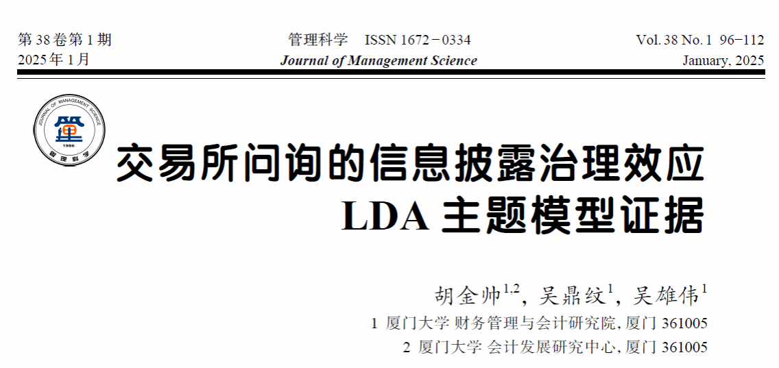 近日,厦门大学财务管理与会计研究院胡金帅教授与其指导的博士研究生吴鼎纹、吴雄伟合作的论文“交易所问询的信息披露治理效应:LDA 主题模型证据”在《管理科学》上正式刊发。