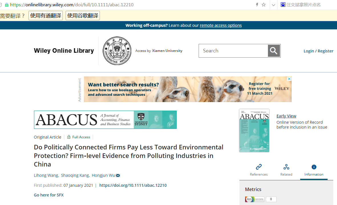 近日,厦门大学财务管理与会计研究院教授、博士生导师王荔红(第一作者),与厦门大学管理学院副教授吴红军(通讯作者)、财务管理与会计研究院博士研究生康少青合作撰写的论文“Do politically connected firms pay less toward environmental protection? Firm-level evidence from polluting industries in China”在国际知名财务、会计类期刊Abacus: A Journal of Accounting Finance and Business Studies在线发表。