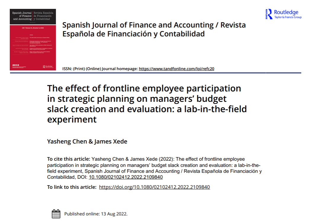 我院博士生导师陈亚盛教授与其指导的来自加纳的2017级会计学博士生James Xede合作的论文“The effect of frontline employee participation in strategic planning on managers’ budget slack creation and evaluation: a lab-in-the-field experiment(一线员工参与战略规划对管理者预算松弛与预算执行评价的影响:一项实地实验)”在国际期刊SPANISH JOURNAL OF FINANCE AND ACCOUNTING上正式刊出。SPANISH JOURNAL OF FINANCE AND ACCOUNTING是SSCI检索国际期刊。