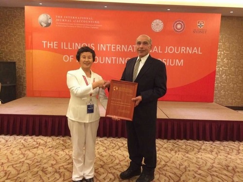 此次《会计国际期刊》研讨会(TheIllinois International Journal of Accounting Symposium 2015)还专门为曲晓辉教授制作了牌匾,由《会计国际期刊》主编R.Abdel-Khalik教授亲自颁发,以表彰曲晓辉教授多年来对会计教育及会计职业所做出的杰出贡献。